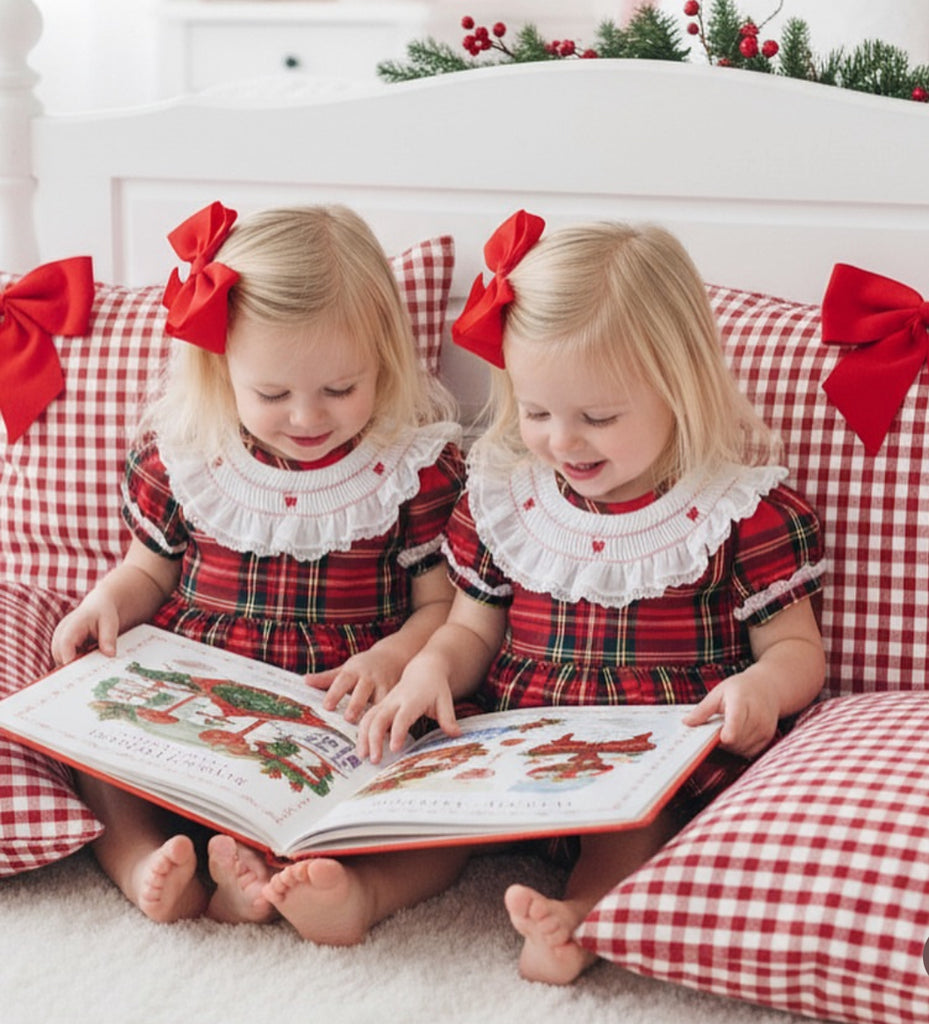 A timeless festive favourite, this beautifully detailed red tartan dress features exquisite hand-smocking and delicate embroidered accents. The standout frilled white collar with lace trim adds a charming vintage touch, perfectly complemented by puffed sleeves with matching lace edging. A classic silhouette, while the large white sash ties into a statement bow at the back for an elegant finish. Perfect for Christmas celebrations, family gatherings, and special occasions.