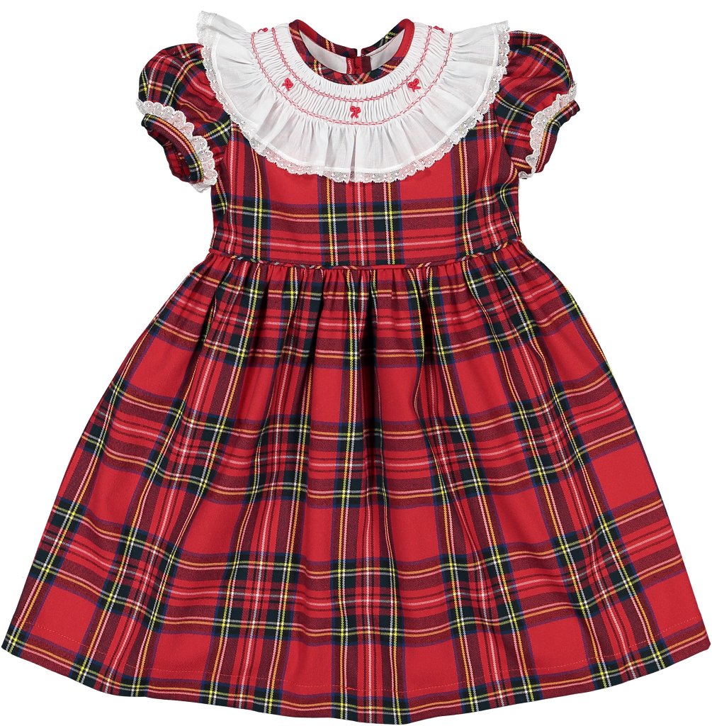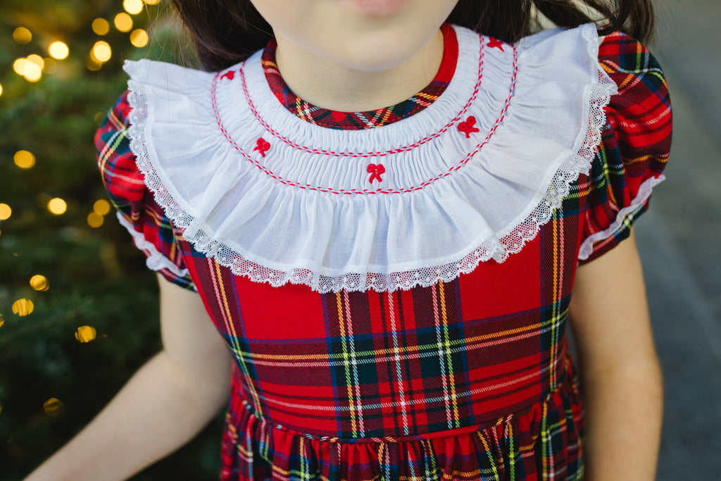 A timeless festive favourite, this beautifully detailed red tartan dress features exquisite hand-smocking and delicate embroidered accents across the chest. The standout frilled white collar with lace trim adds a charming vintage touch, perfectly complemented by puffed sleeves with matching lace edging. The full, gathered skirt creates a classic silhouette, while the large white sash ties into a statement bow at the back for an elegant finish. Perfect for Christmas celebrations, family gatherings, and special occasions.