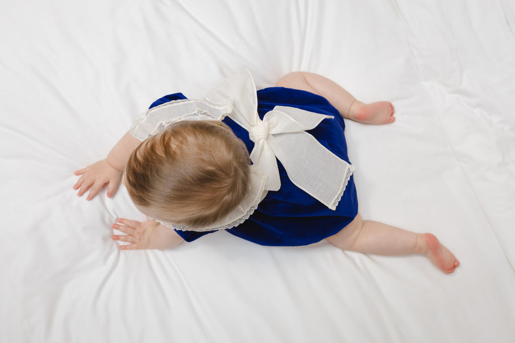 This charming navy velvet romper brings together timeless style and playful comfort- perfect for little ones on special occasions. Crafted from beautifully soft velvet, it features a crisp white waistband and an elegant double-layered lace collar that adds a classic, heirloom feel. The puff sleeves are finished with delicate lace trim, giving the romper a sweet and refined touch.