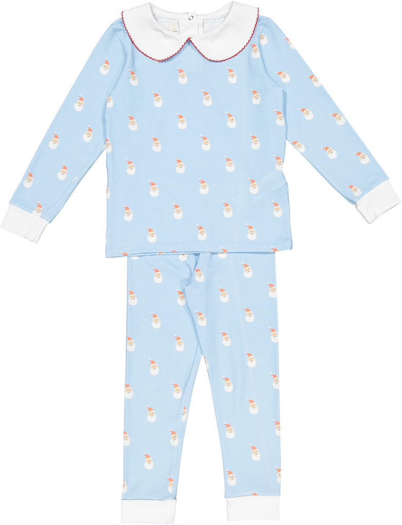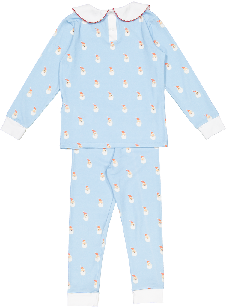 Bring festive cheer to bedtime with this adorable light blue pyjama set. Featuring a charming all-over Santa face print, it’s made from soft, breathable cotton for a cosy night sleep. The classic Peter Pan collar trimmed in red adds a sweet, traditional touch, perfect for the holiday season. A delightful choice for Christmas mornings, sleepovers, or simply snuggling up.
